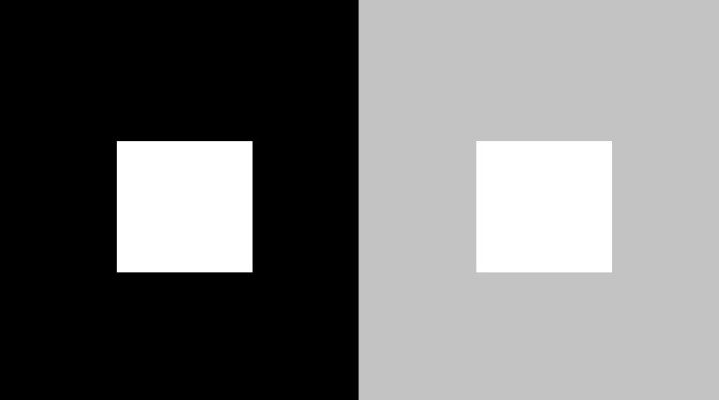比如如果要说上面这张图片,哪一边的白色方块更亮?很显然是左边!但问题是左右两个白色方块其实是同样的亮度,他们的区别仅仅在于背景的明暗度,也就是对比度。所以在相同亮度下,对比度越高,会让人眼的觉得更亮,这点是没有疑问的。这其实是一个生理现象:在图像不同区域的对比度,人眼对亮度的感知也存在差异,因为我们的视觉系统会解读亮度相对于周围环境的差异。