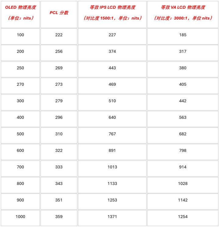 大家可以知道的是,OLED、IPS/ADS、VA这几种不同面板,在相同物理亮度下都有相应的PCL,或者说不同对比度的显示产品,即使实际物理亮度相同,但PCL值是不同的。在相同PCL值下,对比度越高的显示设备,实际物理亮度就小;对比度越低的显示设备,实际物理亮度就高。换句话说,对比度更低的电视和显示器,需要发出更高的物理亮度,才能让人眼体验到和高对比度显示设备差不多的感知亮度。